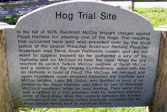 Sometimes the story is so strong that it is actually written in stone, as is the case with the infamous “hog trial.” There is no documentary evidence that the hog trial ever took place. It is entirely based upon local lore and the 1888 writings of the New York reporter, John Spears. Having personally heard the local lore from people whose memories went back further than John Spears, I believe that there was a dispute over a hog involving Ran’l McCoy, which was settled by Preacher Anse Hatfield. While I believe that, I KNOW that the hog trial could not have happened the way it is presented in the feud tales.