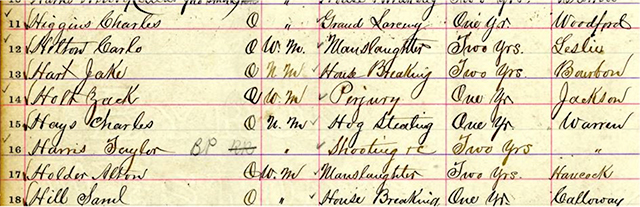 The 1890 register of prisoners in the Kentucky State Pen has several men incarcerated for the felony of hog stealing. Here’s one, on line 15: