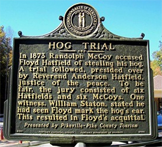 The sign starts off wrong: Floyd Hatfield was NOT charged with hog stealing, which was a felony, and, as such, could not have been tried by a Justice of the Peace.