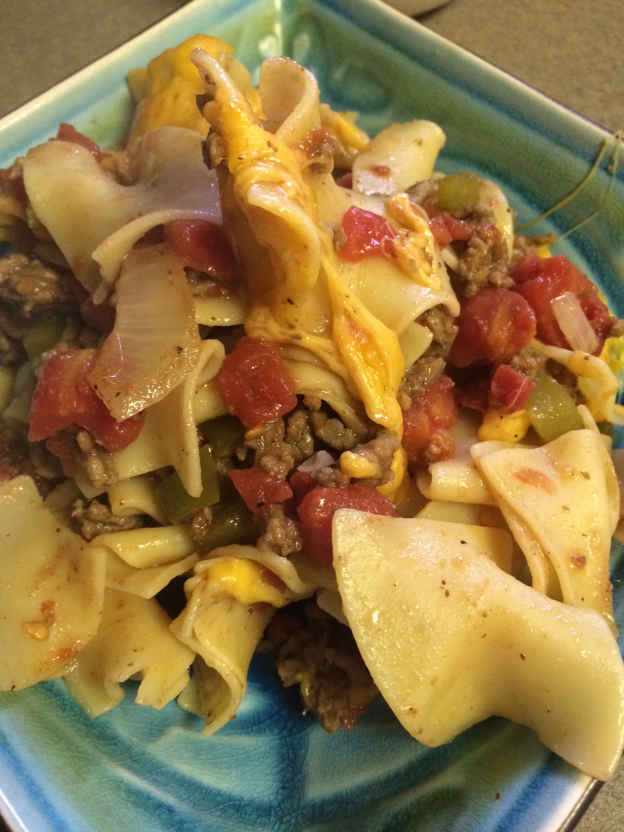 Want an easy dish that’s sure to please the family? Cheeseburger casserole is a hearty, tasty meal that took about twenty minutes prep time and fifteen minutes in the oven (enough for the cheese to melt). It’s got that great cheeseburger flavor, and even manages to sneak in veggies with onion, green pepper, and tomatoes. (You could also add mushrooms or even jalapenos.)