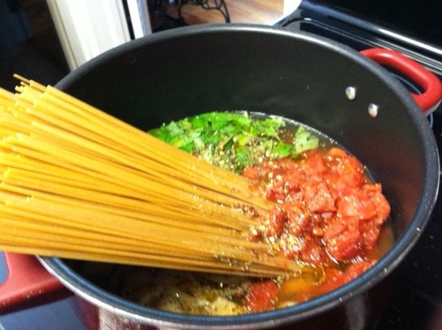 One Pot Wonder? Yes please. As a mom of a 13 month old, I need quick and easy recipes. Just throw it all in a large pot, cover, boil for 10 minutes and voila, you have a delicious pasta dish. The only thing I would do differently is lessen the amount of red pepper flakes, as I like spice, but not too much of it.