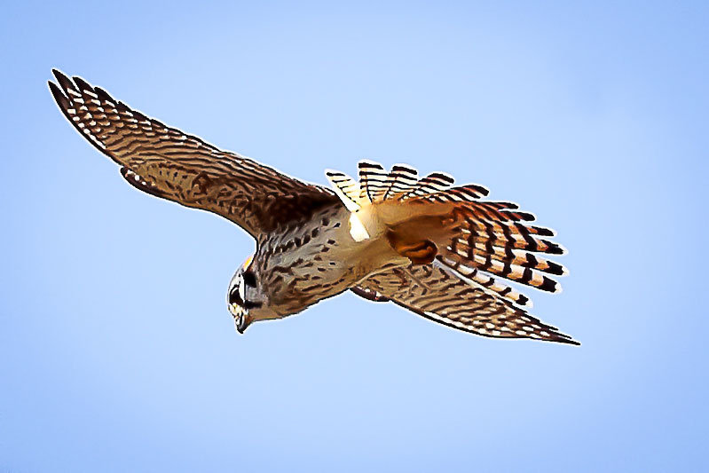 Conservation Note: The numbers for this species are in steep decline. Several situations have caused the problem including habitat loss (fewer agricultural areas that have since become reforested or urbanized) and pesticide use that depletes insect populations. For those interested in helping, consider providing a kestrel nesting box (info here American Kestrel Partnership).