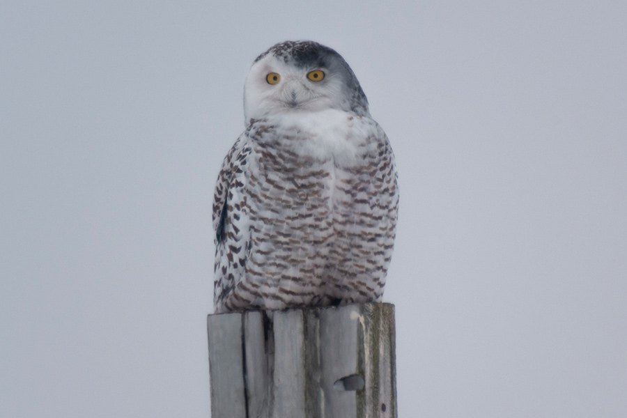 perches. This owl will sit for hours, just swiveling its head – looking and listening for a meal. So have a closer look with your binoculars to see if an unusual “lump” in the field is actually a rare Snowy Owl.