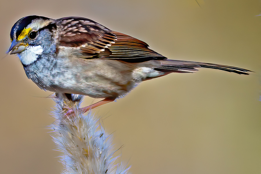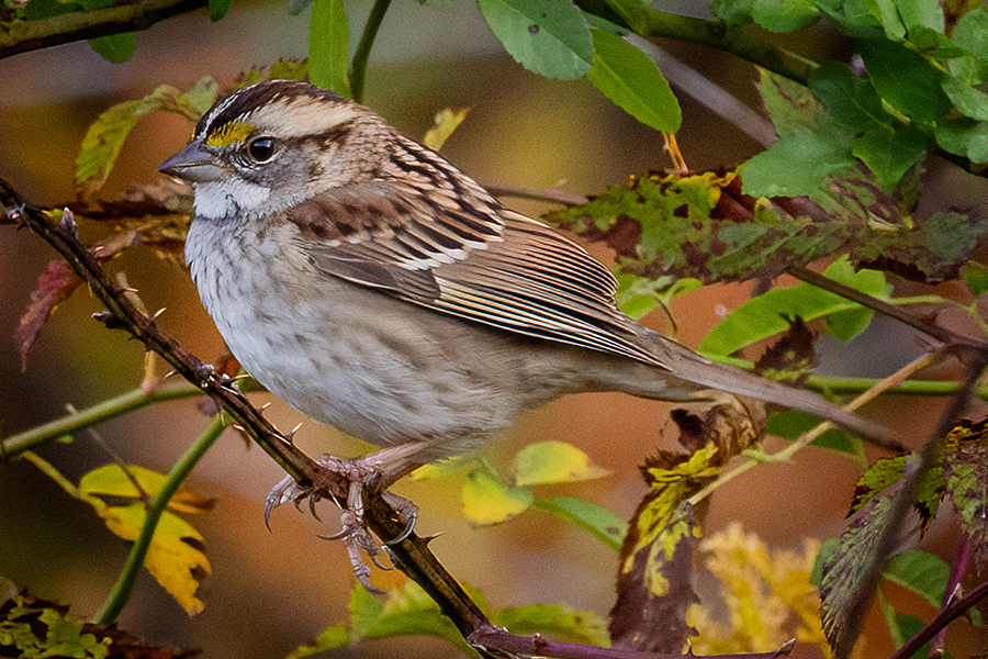 The white throat stands out from its browns and greys as do the two sunshine yellow patches in front of the eyes. The White-throated Sparrow appears in two color forms (or morphs) on top of the head: white striped and tan striped. For mate selection, white-striped individuals often select tan-striped, and vice versa. So, it all works out for these seasonally monogamous couples.