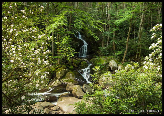 Rhododendron blooms at Mouse Creek Falls located near the Big Creek entrance to Great Smoky Mountains National Park.