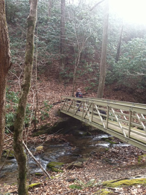 This hike, with an 1,850-foot drop to the gorge from the Blue Ridge Parkway (and of course the parallel 1,850-foot climb back up to it), is often touted as a hike that can take you into two seasons in one walk, which it has done several times for us (spring-summer or winter-fall). We had a hard time, on this record-warmth January day, figuring out which two we might be in; it was pretty much early fall the whole way.