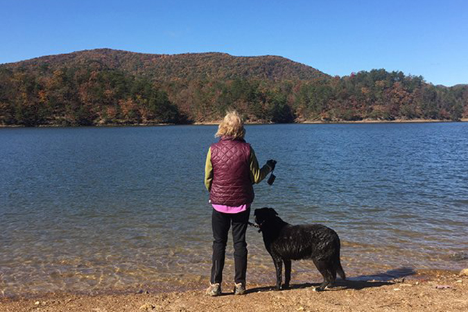 The Tinker Creek Greenway from Plantation Road to the Carvins Cove boat-launch area (2.4 miles each way) is a popular walk, and tends to get more and more crowded—including with people fishing—the closer you get to the shoreline of the reservoir. On this rainy morning, The Greatest Day Hiker Of Them All and I needed to get out little early due to an evening to be spent with two (of the 11) grandkids, and thus were out of the car at just about 11. We’d parked the car in an otherwise empty lot—well except for the giant puddle at the entrance—owing to the fact that the rain had stopped only minutes earlier, and the forecast included the strong possibility for more, along with temps in the 40s, with breezes.Â