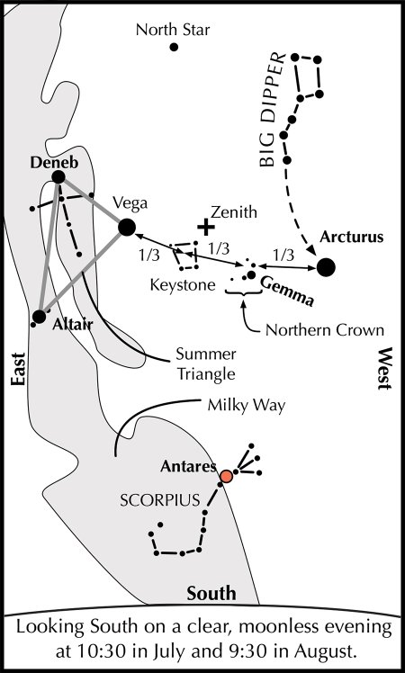 As you gaze skyward on a pleasant summer’s evening, you quickly are drawn to two particular stars. High in the south lies Arcturus, our sky’s brightest star, and nearly overhead shines Vega, a tad dimmer than Arcturus.