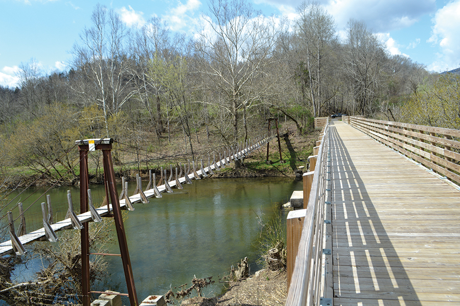 The crushed-gravel path threads through farmland and ultimately crosses the scenic North Fork of the Holston River on a grand, 300-foot-long trestle that includes a lookout lane next to a swinging bridge. In the last mile to the west, the trail reaches Mendota—a once-incorporated town but now a sleepy village at the foot of densely forested Clinch Mountain.