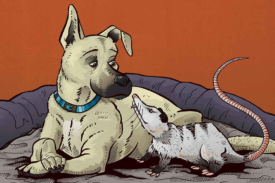 Well, as Disney-like as this charming scene is, I have three other dogs that would be thrilled to treat this possum like an interactive chew toy. If they wake up, it’s going to be a boatload of chaos in my house. I called Biscuit, who looks so proud of herself, off the bed and then quickly folded the bed up to make a trapped possum taco of sorts, taking it outside and freeing Biscuit’s brand new best friend.