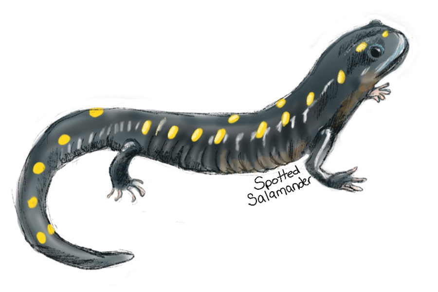 On the day of the first spring rain, I pull on boots and go for a quick stomp and splash. The spotted salamanders are also ready for a splash. Vernal pools are filling. These temporary ponds won’t last through the summer, but this makes them the ideal place for salamanders to meet up and mate. A pond that dries up is no place for fish. A pond with no fish is the perfect place for amphibians that don’t want their eggs or hatchlings to become fish food.