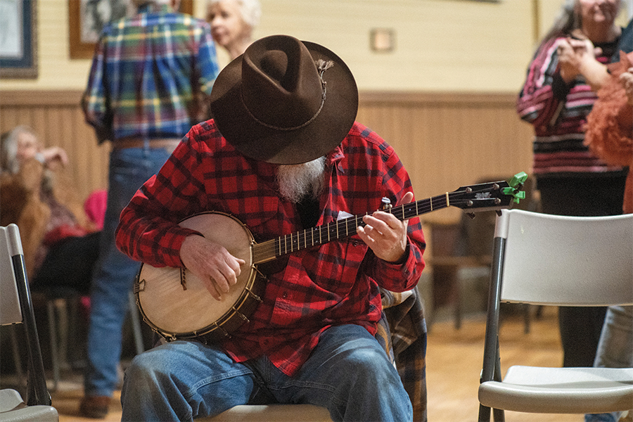 Admission to the jam is free, so the cakewalk acts as a painless fundraiser to keep the lights on. During the jam’s first hour, up to 40 musicians gather to make sweet music as couples waltz around the perimeter or stay in place to flat-foot. There might be a dozen each of fiddles, banjos and guitars, plus a few bass fiddles, dulcimers, mandolins, autoharps and even a washboard. Local fiddler and National Heritage Fellow Eddie Bond calls the tunes and adds vocals.