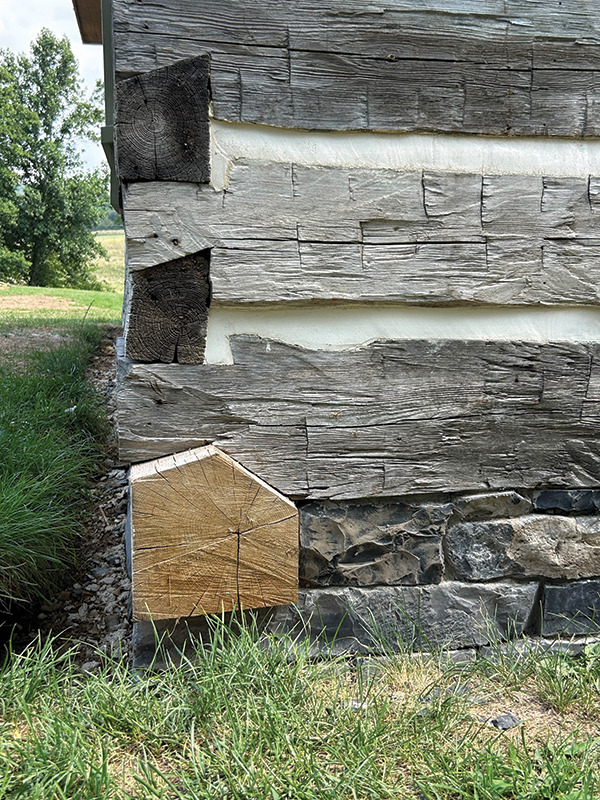 When Traylor returned to the cabin, he found the logs on one side were rotten. Originally a two-story structure, only the top floor could be rebuilt. He removed each log, labeling it with a blue tag, and then photographed the log’s end for backup identification. Then he hauled it away to land he owns in West Virginia. There it sat, waiting for its future.