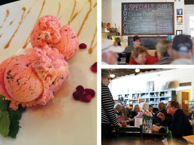 The menu at The Café at Williams Hardware is reminiscent of a Southern tea room. For breakfast, Everything Grits consists of cheese grits blended with ham, sausage, onion, and green pepper and topped with an over-easy egg and bacon.